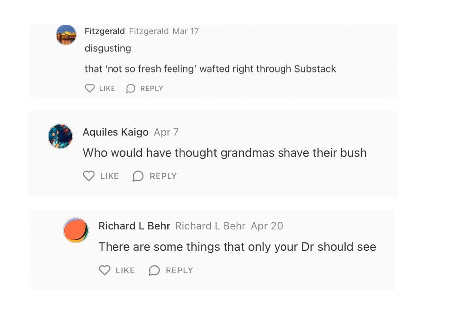 If you look at some of the comments on my viral On Getting Old essay, which features Aleah Chapin’s series of beautiful naked older women, you can see that a few people were uncomfortable with women’s nudity; older women cavorting naked and playing together. No shame, no hiding, removing all insinuations of sexualness and just being joyful. Again, the women might be fuck-able, but what they are selling in the art is not about men’s sexuality. It’s about their own personal freedom.