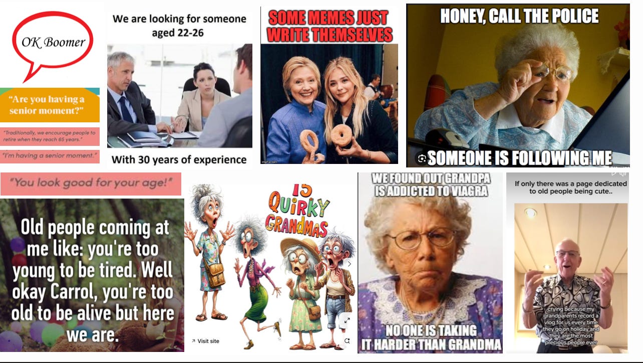 With memes, another study found that older people were often portrayed as immature, child-like, less intelligent, blundering, and emphasized their dependence on other people. Older people were perceived as unsophisticated and not being up on cultural references. The Look at them now! pages advertised all over social media as click bait, are fraught with once-young viral celebrities now aged, with cellulite, bulges, out of control bodies and faces caught without makeup or flattering lighting.