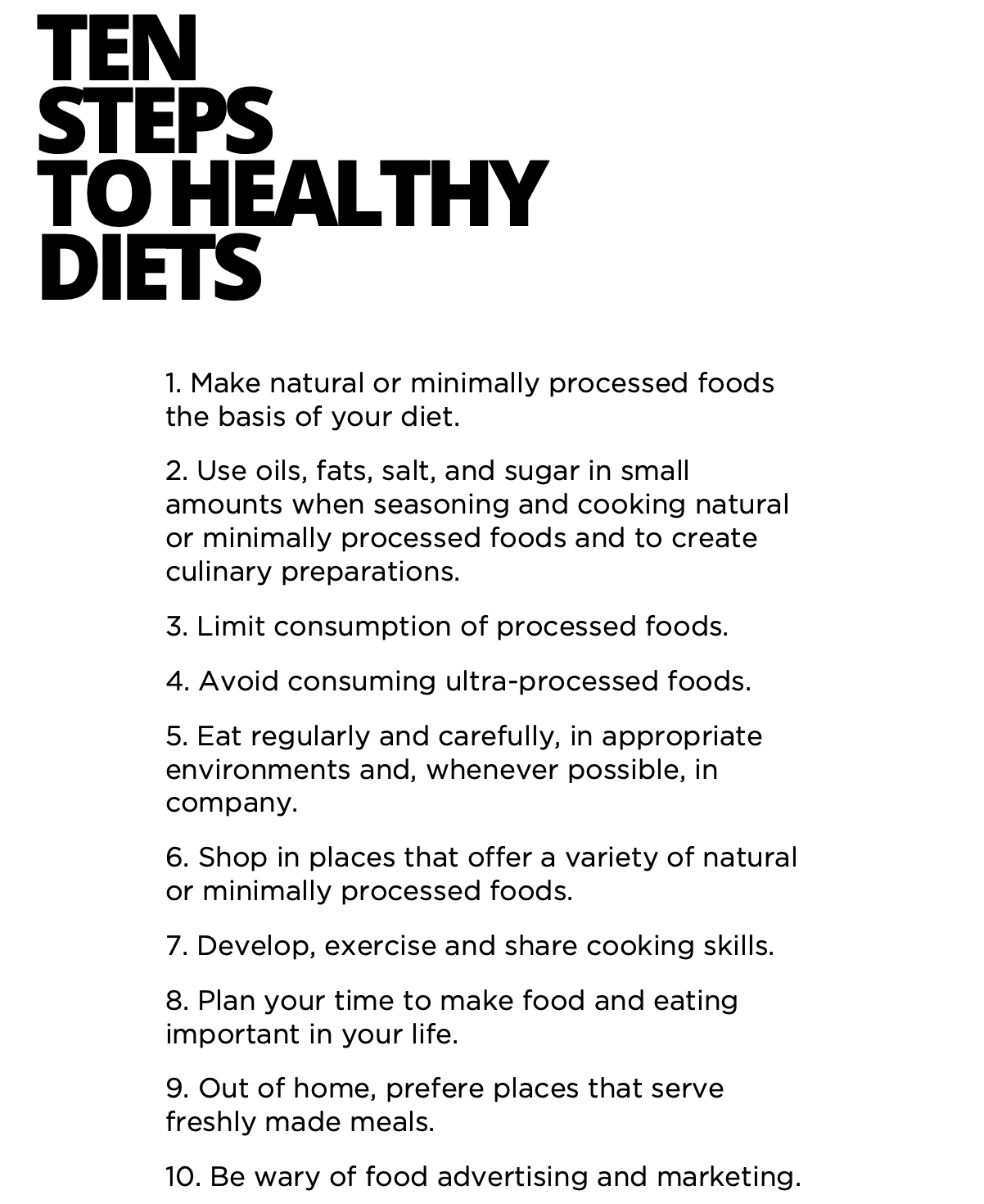If you read most food guidelines, they are about beating down obesity and diseases. Our guidelines do this as well. This makes eating feel punitive. Brazil wants their people to embrace cooking and eating as a lifetsyle change that is about personal and family fulfillment.