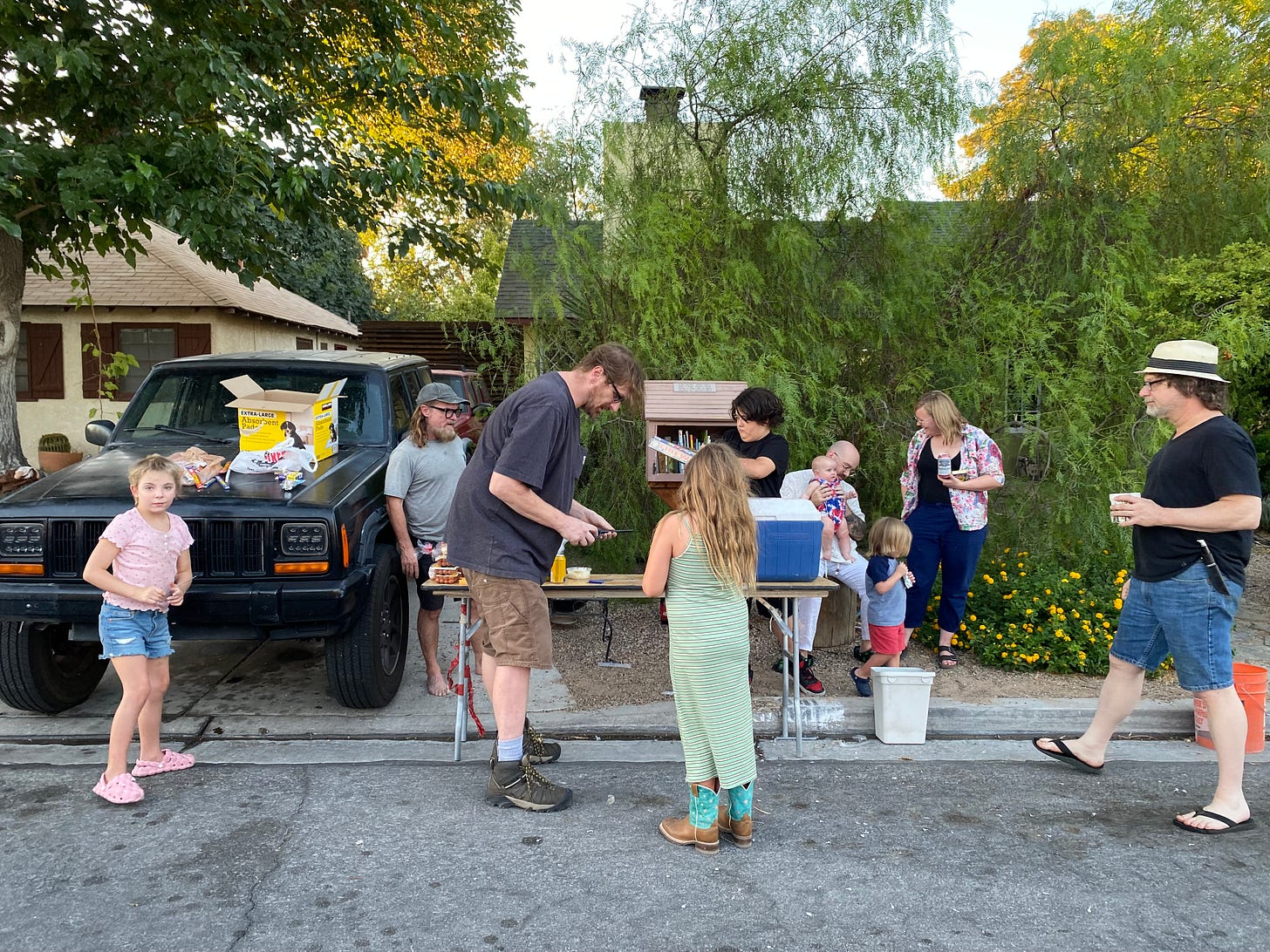 Jack, and his wife Kim, aren’t my peers. Jack is a Vietnam vet, so more like my Dad or favorite uncle. And T is a decade or so younger than me. Our lives didn’t perfectly slot. When I had little kids, T didn’t have them at all. Now she has her daughter, LJ, who is five, and my youngest kids are growing into teens. Neighbors come to mean things to each other by their proximity, not how effortlessly they slot into schedules, hobbies and preferences. You are a good neighbor, not as a main player, but in the in-betweens, in the cracks of life. Neighbors and neighborhoods are our living playlists, our murals, our fabrics.
