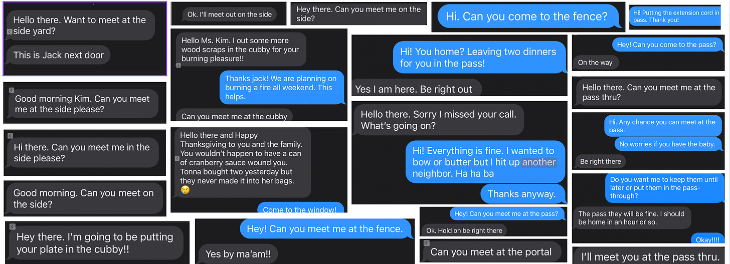 The pass became the place where I left plates of lamb and potatoes when T was away and wanted to make sure he ate. Jack put leftover wood scraps from his projects in the pass, free wood for our fires. Jack came to the pass to tell me when LJ was born. I stored T’s extra breast milk in my big freezer when they ran out of room. When he got meds from the VA and wasn’t around to pick them up, I sent Raffi over to get them. We left them in the pass. When they weren’t off to Disney with LJ, they popped in for the holidays. Living next door, made proximity a solid holiday draw. Hot pot for Christmas, Yakitori Thanksgiving, hot dogs in the street with Indian Rez fire works, on July 4th.